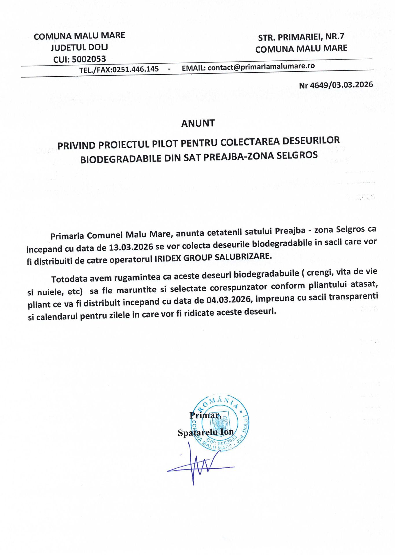 Anunt colectare deseuri biodegradabile