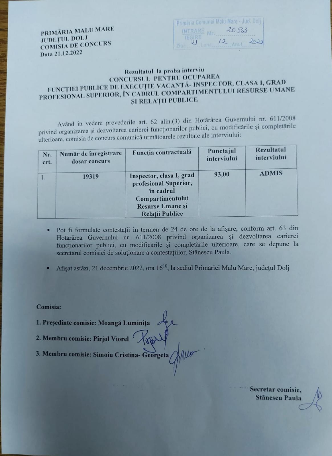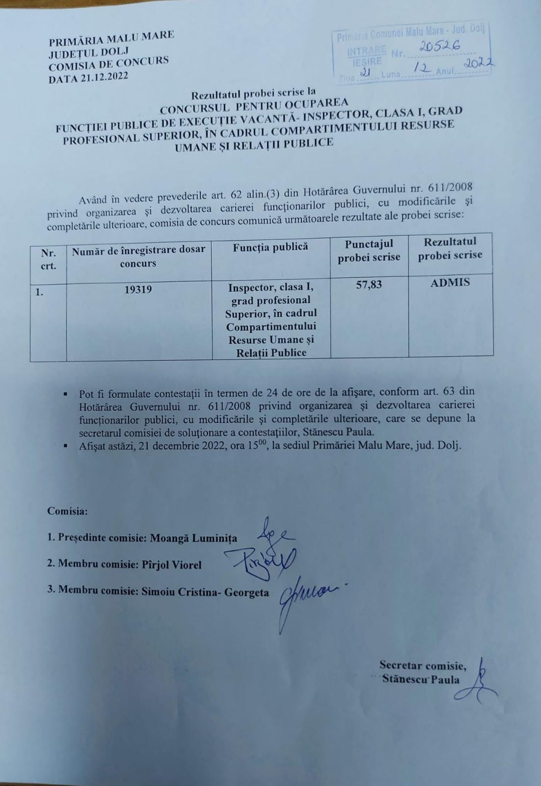 Anunt organizare concurs pentru- Inspector, clasa I, grad profesional Superior, în cadrul Compartimentului Resurse Umane si Relații Publice.